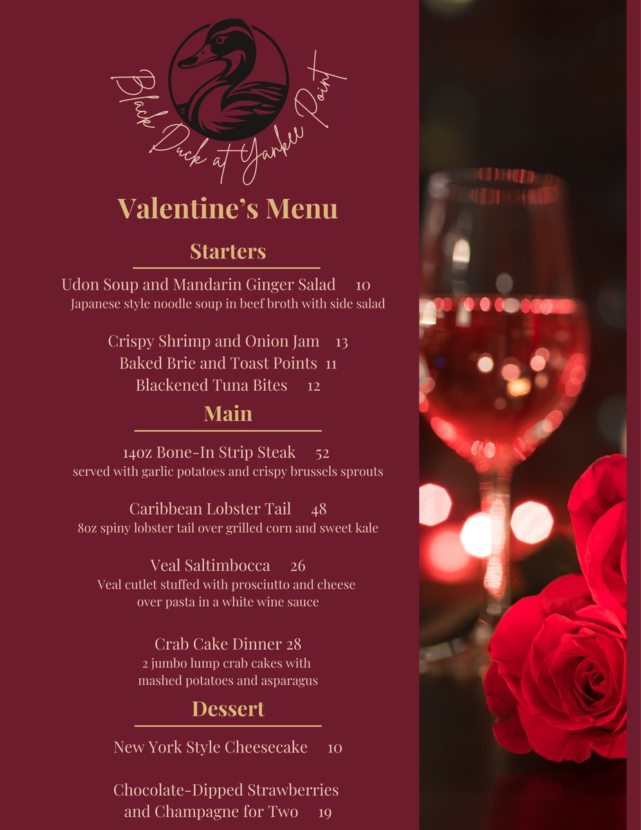 Treat your special someone to this special menu! We were booked out last year, so be sure to get those reservations IN so you can stay OUT of the proverbial doghouse.